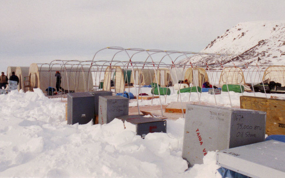 Taiga provided a full set-up crew to erect tents, outfit the kitchen, dining room and restroom facilities and prepare the camp for use. The crew and 40,000 lbs. of gear arrived in Nome mid-day Thursday , and, by Tuesday of the following week under adverse conditions of low temperatures, high winds and minimal daylight, the camp was completely ready for use.